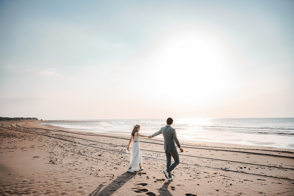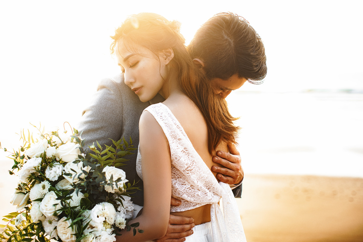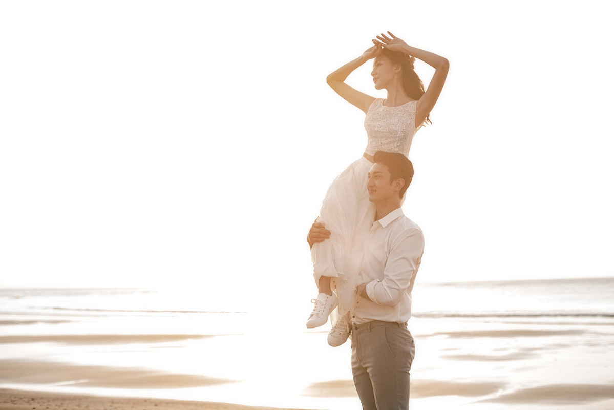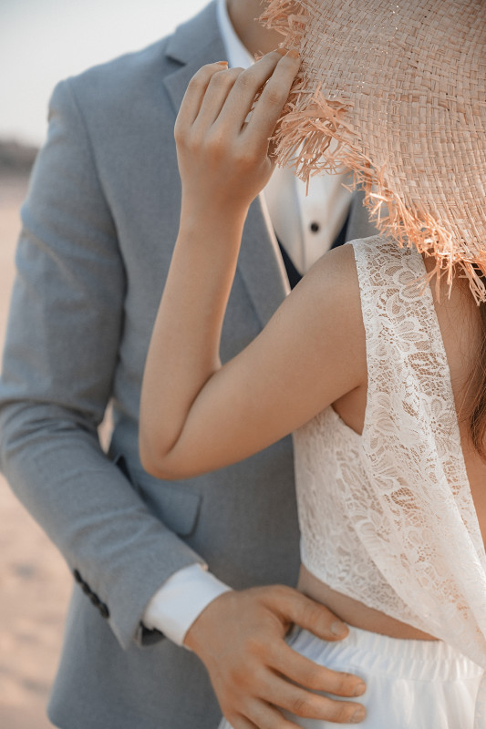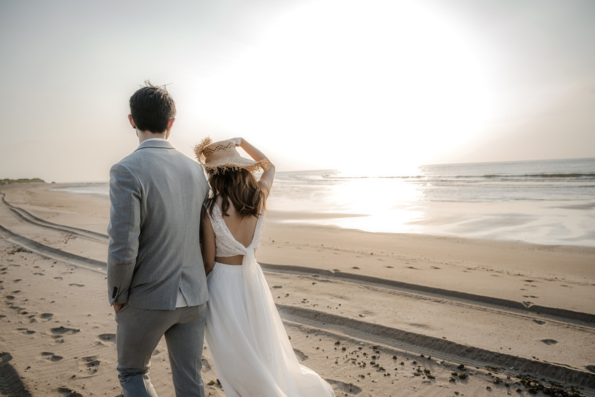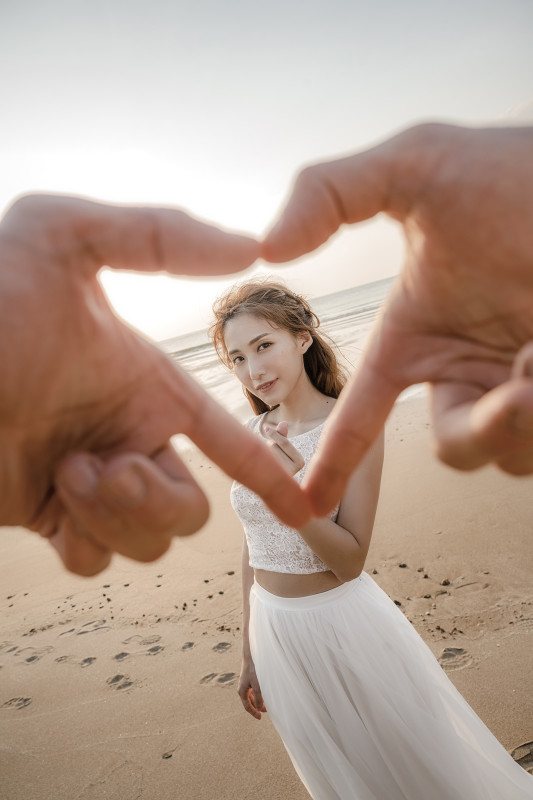 這組漫步沙灘的海邊婚紗照宛如浪漫電影場景般夢幻。夕陽的餘暉照映在沙灘上,新人牽手、擁抱、自在地漫步在沙灘上,享受著這一刻的甜蜜時光。輕婚紗隨風飄揚,柔和的陽光勾勒出曼妙的身影,散發出一種詩意的浪漫。每一步都在沙灘上刻畫出了愛情的足跡,將那份心靈深處的悸動定格成最浪漫的海邊婚紗照。