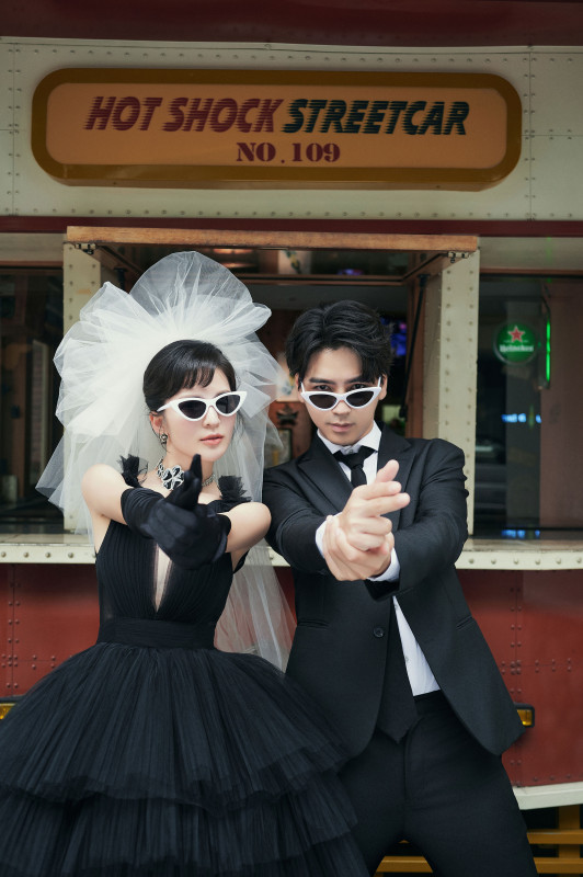 這組創意婚紗照中的黑色禮服與白色頭紗的強烈對比營造出濃烈的戲劇性,仿佛置身於經典電影場景中,既神秘又充滿現代感!率性十足的戰鬥靴和白色墨鏡,突顯出時尚與品味並存的個性婚紗照,每一個鏡頭都流露出新人的默契與時尚態度,仿佛他們正走進屬於自己的黑白電影世界。